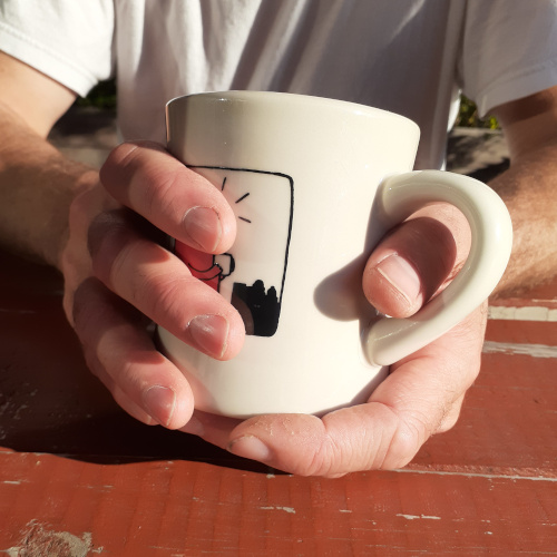 Met up with sculptor and researcher Kris Brown at Seven Stars on Broadway at 9am. Kris had just installed a big sculpture (or maybe you say "public art piece"?) at PVD Fest downtown, we talked about stockpiling materials, being an artist that changes their frame constantly, co-housing, low-income housing developement in Providence, and being a parent. I've known Kris for about ten years but lately we only see each other in passing, it was really nice to sit and jam. Kris got to the coffee shop a little before me (and I tried to be early) and as a consequence already had a cup of coffee when I got there. Which is why the mug is a latte mug. I got a refill later. No refills on the latte, it's too involved.